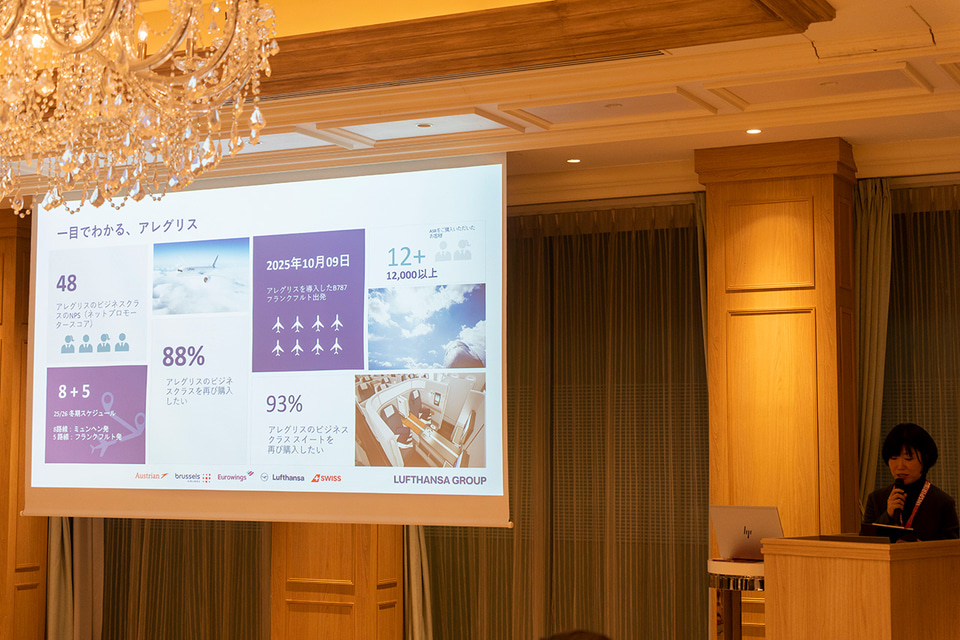 日本からドイツ各地へはルフトハンザが直行便を運航中。ルフトハンザ ドイツ航空からは澤田亜紀子氏が登壇し、10月27日から羽田~ミュンヘン線の機材にも導入した新仕様客室「アレグリス」を紹介した。特に5種類のシートタイプから選べる「ビジネスクラス」が高い評価を得ているということで、より快適なドイツ旅行を満喫できそうだ。