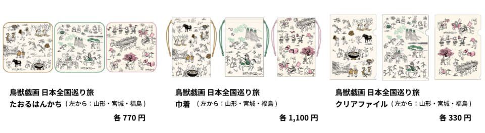 また、同フェアに合わせ、和風雑貨「鳥獣戯画日本全国巡り旅」の山形・宮城・福島デザインを販売。ラインアップはタオルハンカチ(770円)、巾着(1100円)、クリアファイル(330円)など。