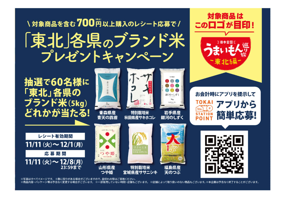 さらに、東北のブランド米が当たるキャンペーンも実施。フェア対象商品を含む税込み700円以上購入のレシートを用意することで、「TOKAI STATION POINT」アプリから応募でできる。応募期間は11月11日~12月8日23時59分。