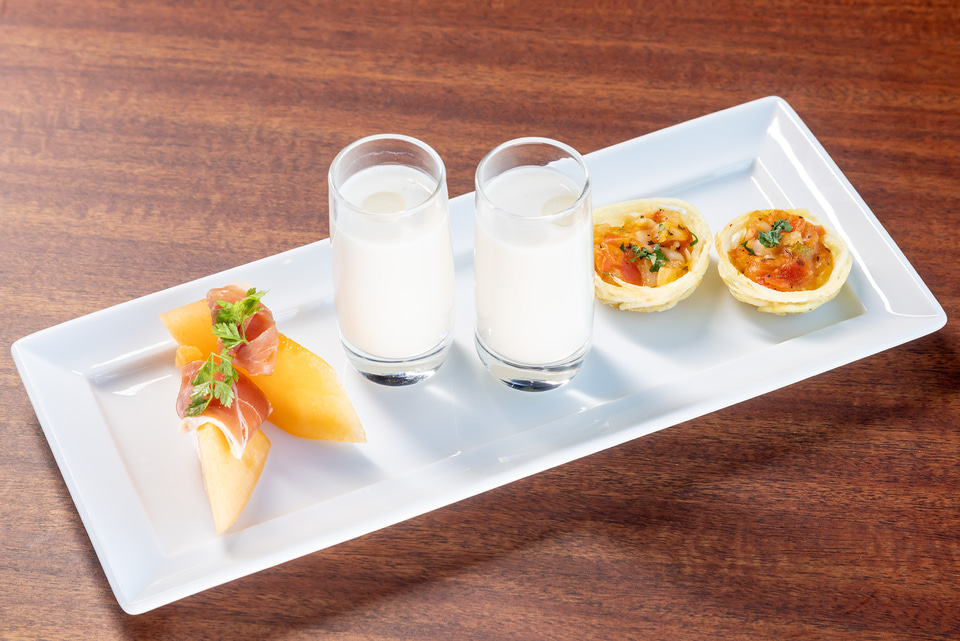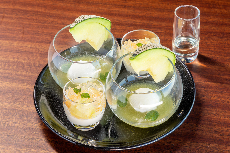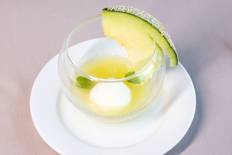 ってわけで、最初に手を伸ばしたのがメロンのスープ。これはミキシングしてジュレ状にしたメロンとノンアルコールのスパークリングワインを混ぜ合わせ、ヨーグルトソルベを浮かべたもの。スープはメロンの果肉感とともに甘みを感じる仕上がりで、その部分だけ飲むとドリンクのようなさわやかさ。そこにコクと酸味があるヨーグルトソルベが加わると一気にリッチな味わいになる。ちなみに、今回は網目模様が美しいアールスメロンを使用しているが、その時々で美味しい種類をチョイスしているとのこと。