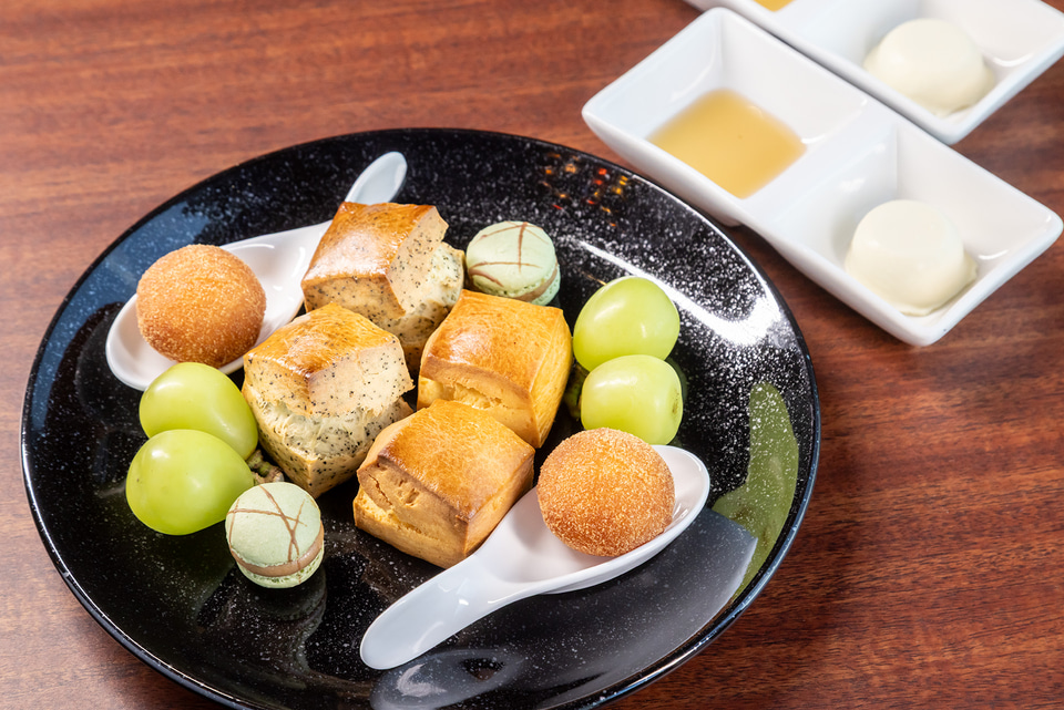 下段: シャインマスカット、紅茶スコーン、スコーン、イタリアンフリット、本日のマカロン