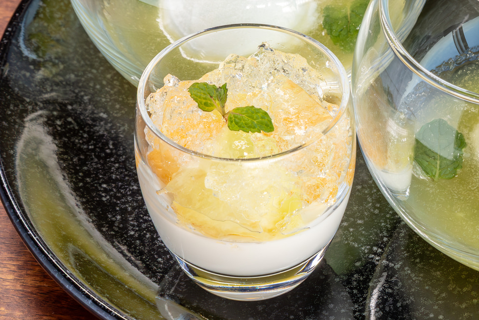 上段: ノンアルコールスパークリングワインを注いだメロンのスープ ヨーグルトソルベを添えて、メロンのパンナコッタ