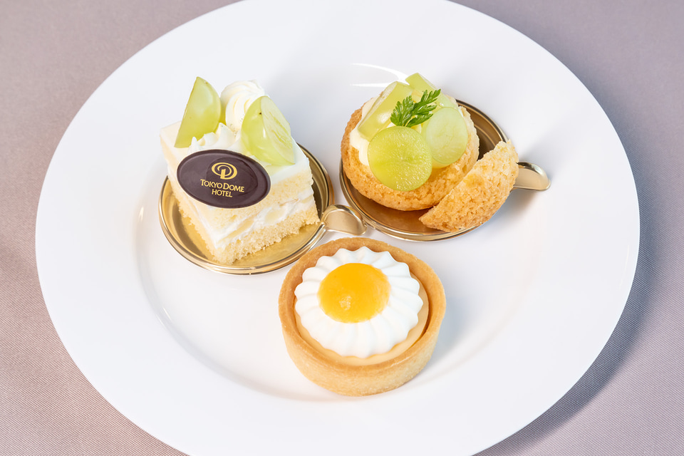 中段: シャインマスカットと洋梨のショートケーキ、レモンのタルト、シャインマスカットのシュークリーム