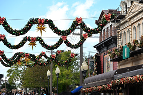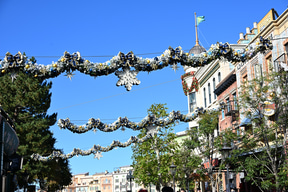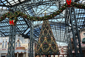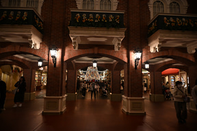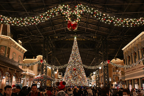 ランドの見どころは、ワールドバザール中央の約15mものクリスマスツリー。天井に届くかと思うほどのサイズは、どこから撮っても記念になる。周囲のミッキーシェイプのガーランドとともに撮影するのもお勧めだ。