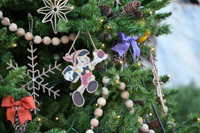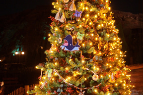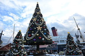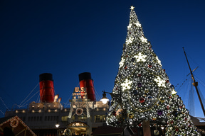シーでは、アメリカンウォーターフロントに高さ約15mのツリーを設置。こちらは夜になると光のギミックも楽しめる。キラキラと輝くツリーをゆったりと眺められるのは、パークだからこその特権だ。
