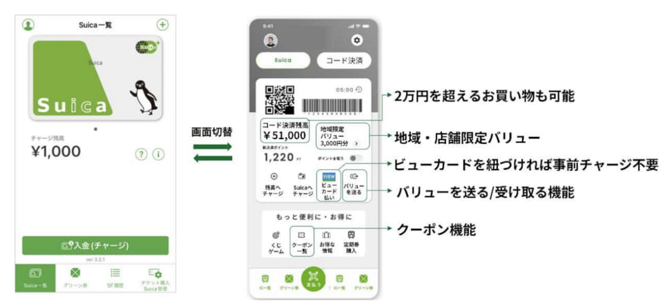 コード決済サービスが開始すると、バリューの送る&受け取る機能により家族や友達間で受け渡しが可能に。また、ビューカードを紐づけることで、クレジットの利用限度額を上限として事前チャージなしでコード決済を使った買い物が可能になるという。さらにクーポン機能、地域や店舗限定のバリュー発行機能も追加していく。