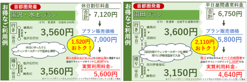 関越自動車道(E17)沿線のウィンタースポーツや温泉などをゆったりと楽しみつつ、混雑を避けて快適でお得に高速道路を利用できるようにした商品。休日の特定の時間帯、または平日に復路を走行した場合、通常付与されるETCマイレージサービスのポイントに加えて、最大で販売価格の20%のマイレージポイントを付与する。