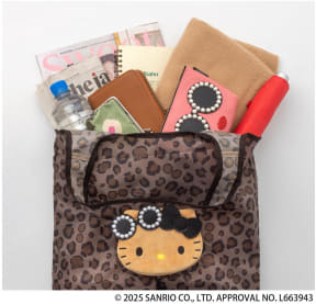 バッグブランド「アジョリー」と、大人気「日焼けキティ」がコラボしたオリジナルのヒョウ柄バッグが登場。収納一体型になっており、バッグをクシュッとまとめて巾着を絞ると“ぬいぐるみ”に変身。ウィンターシーズンも元気に日焼けしたハローキティが、アジョリーのアイコン“パールサングラス”をかけた、レアでキュートな姿がポイントになっている。