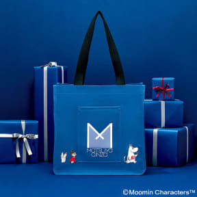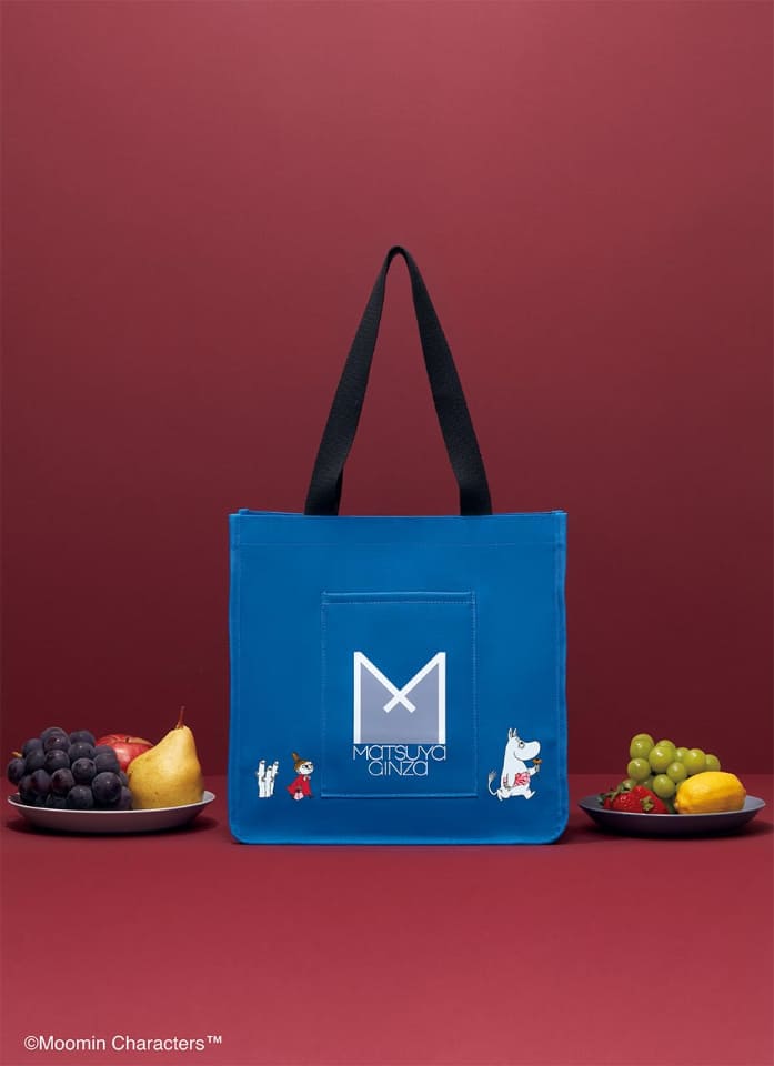 ムーミン小説出版80周年と松屋銀座開店100周年を記念してコラボが実現。ショッピングトートバッグは松屋銀座の昭和後期の紙袋デザインを復刻させたデザインになっており、厚みとハリのある鮮やかなブルーの生地で紙袋のスクエアフォルムを再現している。