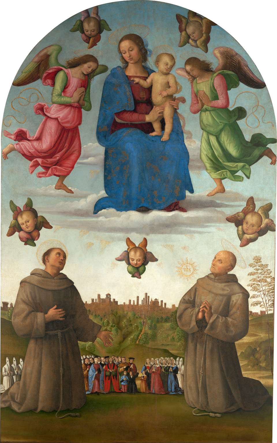 正義の旗 ― 聖フランチェスコ、シエナの聖ベルナルディーノ、祈る正義兄弟会の会員たちのいる聖母子と天使