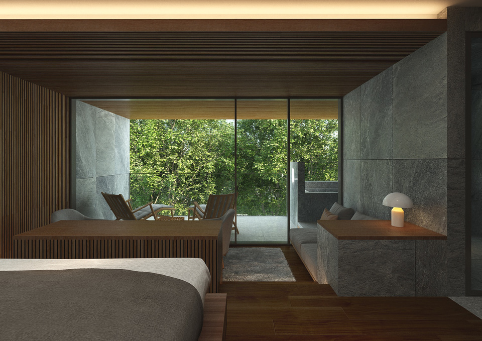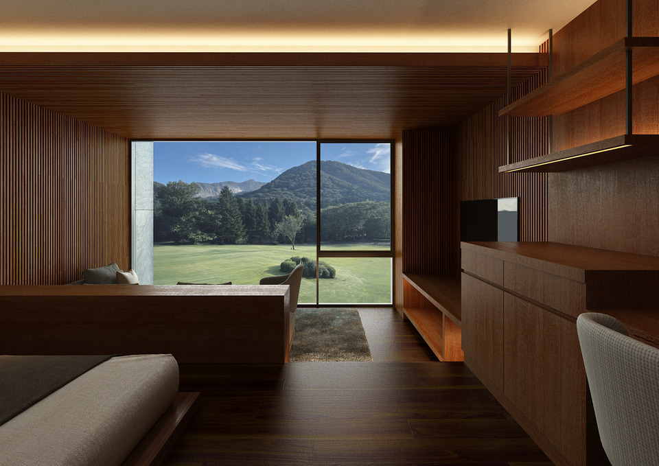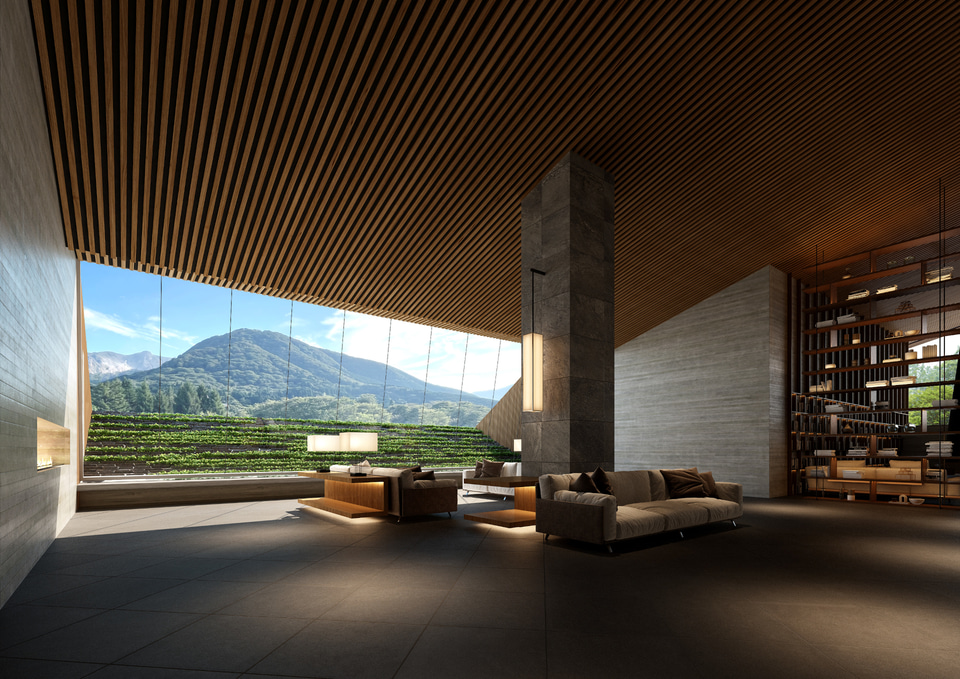 旧財閥の別邸をルーツに持つ同ホテルのリニューアルコンセプトは「箱根の大自然に包まれた森の別邸」。1万3000坪の敷地に広がる芝庭と森林、そして大涌谷の稜線を望む立地を最大限に活かしつつ、既存棟の建て替えや改装を行ない、全65室を設ける。敷地面積は4万2052m2(変更なし)、リニューアル後の延床面積は8122m2。