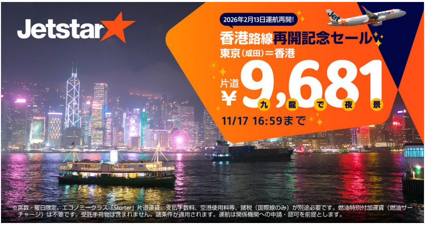 ジェットスター、成田~香港線を2026年2月13日再開。片道9681円からの記念セールも