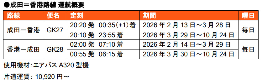 GK27便: 成田(20時20分)発~香港(翌00時35分)着、毎日運航