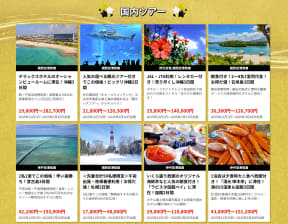 国内ツアー(航空券+宿泊など含む)では、首都圏発「復路は全便同代金!選べる那覇市内ホテル!沖縄3日間」(1万7800円~)や「海鮮が並ぶ朝食付!OMO函館 by 星野リゾート2日間」(2万2800円~)、関西発「2名1室でこの価格!早い者勝ち!宮古島3日間」(4万2100円~)や「売切御免!価格に自信!仙台2日間」(1万4000円~)など、各出発地・方面行きのツアーが多数。