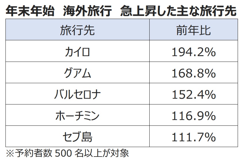 予約者数の前年からの伸びが高い主な旅行先としては、11月1日に大エジプト博物館がグランドオープンしたことが大きな話題となっている「エジプト・カイロ」が前年比194.2%と高い伸びをみせた。「グアム」は、HISが12月29日~31日出発でチャーター便を3本運航することもあり、前年比168.8%となっている(チャーター便は完売)。