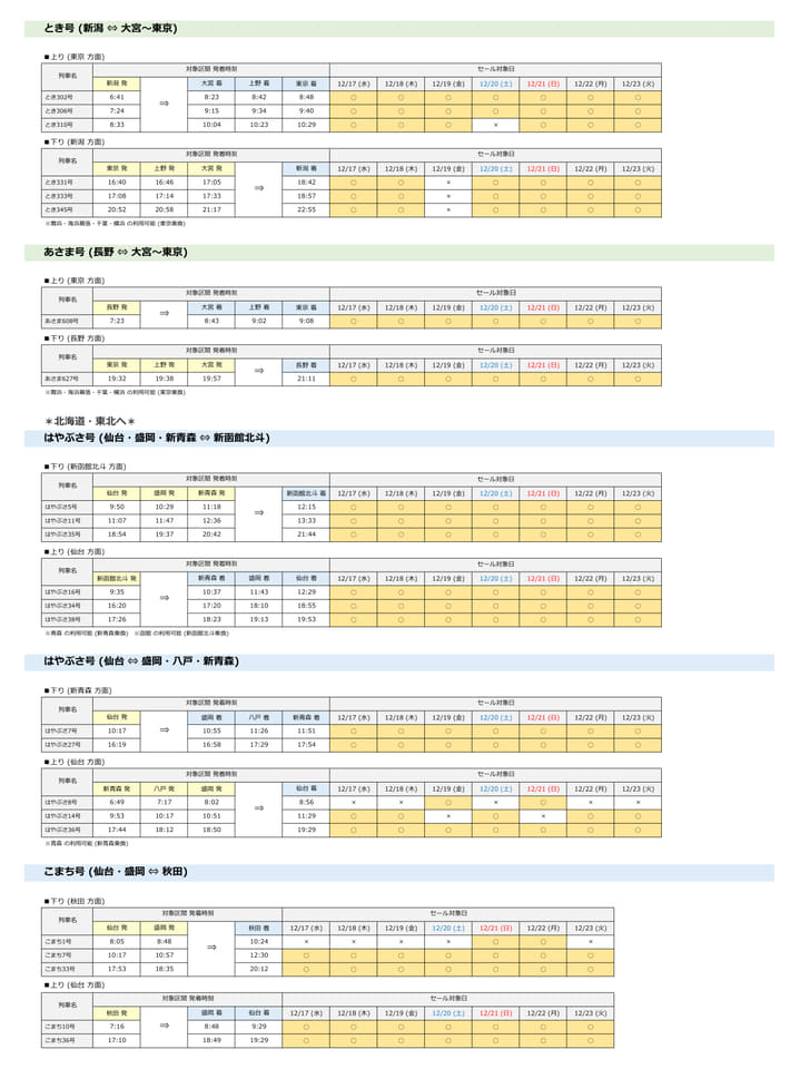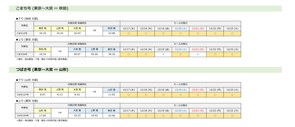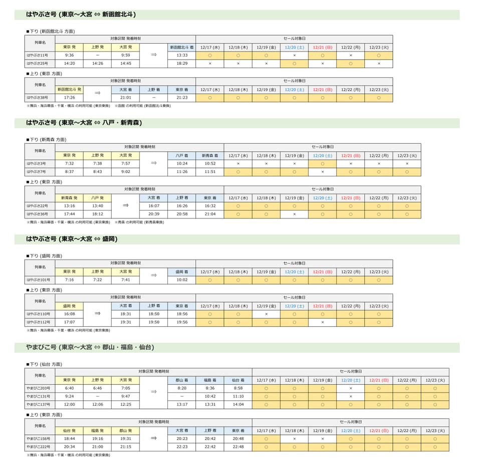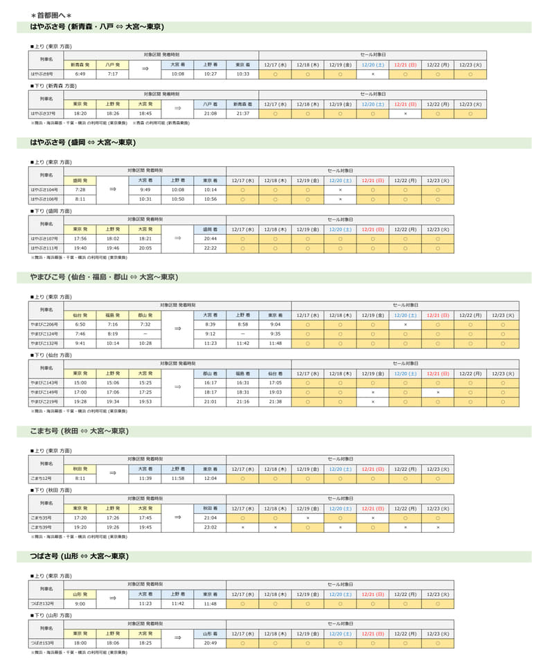 首都圏着の場合はJR東日本の各新幹線(山形駅~新庄駅間、長野駅~上越妙高駅間を除く)が、首都圏発の場合は東北・山形・秋田・北海道新幹線の列車がセール対象。東北・秋田・北海道新幹線では相互間の設定もある。