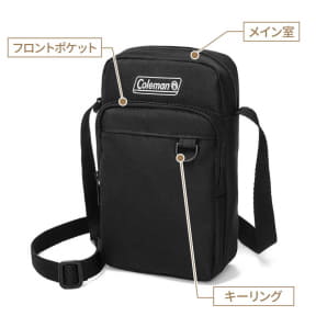また、フロントにはキーリングが備わり、お気に入りのチャームを付けるなどアレンジも可能。最長124cmのショルダーストラップは好みの長さで調節でき、アウターの上からでも斜めがけOK。オールブラックの生地にコールマンロゴが映えるシンプルなデザインのため、デイリーからアクティブシーンまで男女問わず使いやすい。