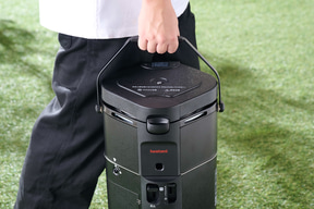 カセットガス式でコードレス、さらに持ち運びに便利なハンドル付きのポータブル設計となっており、食卓での提供はもちろん、アウトドアや防災時などさまざまなシチュエーションで使用可能。本体はブラックをベースに、空間を引き締める上質なレザートーン調となっている。サイズは27.5×27.5×33.4cm(幅×奥行き×高さ)、重さは5kg。