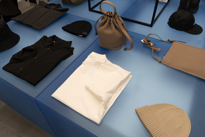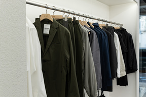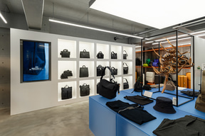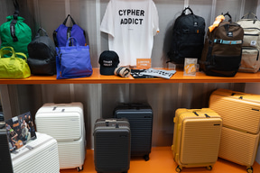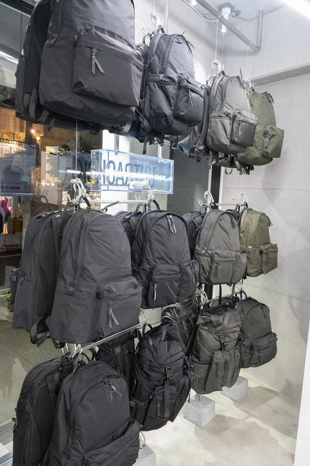 店内では、アイコン的存在のデイパック「〈CITY/DS〉Day Pack」(3万7400円)をはじめ、ヘルメットバッグをモチーフにした「〈CITY PLUS/THE HELMET〉Tote Bag」(3万8500円)、スマホや財布、パスポート、イヤフォンなどを分類して収納できるほか、洗濯機での丸洗いにも対応するジャケット「〈Essential Jacket〉No.60433」(3万8500円)などを販売。スカートなど直営店限定アイテムも取り扱う