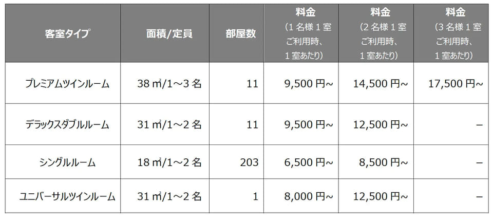 リニューアルにより、客室は全4タイプ・226室に再編。シングルを中心としつつ、空間を広めにとった「プレミアムツイン」「デラックスダブル」「ユニバーサルツイン」も設けている。