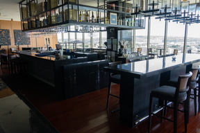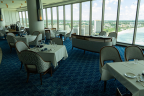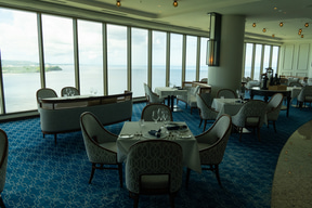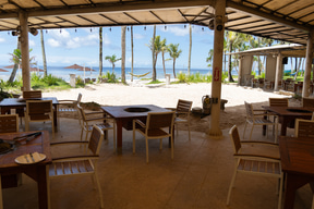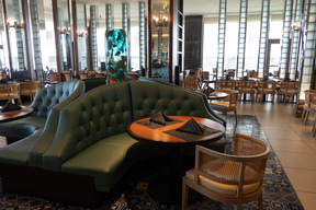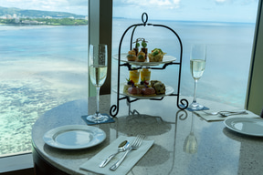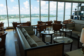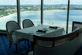 レストランは海の底をイメージした照明効果や床材などにグアムの伝統的な意匠を取り入れており、大きな窓から十分明るい日差しが差し込みつつも、床やソファの色使いで大人っぽい雰囲気にまとめられている印象だ。