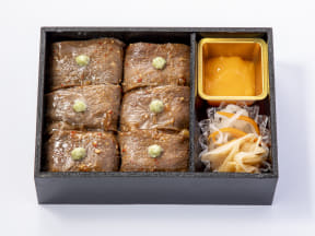 特徴: グランスタ東京限定。東京駅丸の内駅舎の赤レンガをイメージした肉寿司。濃厚な卵黄だれやピリッとしたわさびを添えて。