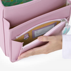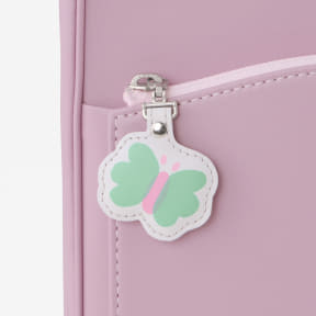 ランドセルの前段ポケットには絵柄に合わせたチャームが付いており、細部にもこだわって仕上げている。丈夫で軽い人工皮革製に加え、広めのマチ設計、大きく開く大容量ポケットや柔らかいファスナーなど、使いやすさも追及した。重さは1220g前後、外寸サイズは26×19.1×32.3cm(幅×奥行き×高さ)。