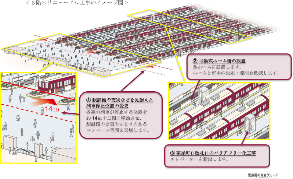 駅設備の充実やゆとりのあるコンコース空間を実現するため、各線の列車停止位置を約14m、十三駅側に移動させる(車両1両は約19m)。停車位置の変更時期は、神戸線が2026年1月ごろ、宝塚線が2026年春ごろ、京都線が2026年秋ごろを予定している。