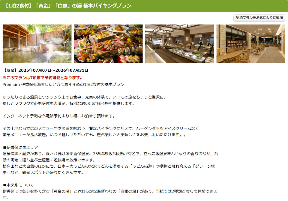 今年7月にスタンダードからグレードアップ開業した「大江戸温泉物語Premium 伊香保」(群馬県渋川市伊香保町伊香保592-1)では、1泊2食付き基本バイキングプランを販売中。価格は、1室2名利用時1人あたり1万4600円〜。