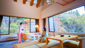 伊香保が誇る2つの源泉、鉄分を多く含む「黄金の湯」とやわらかな湯ざわりの「白銀の湯」をひとつの宿に居ながら楽しめ、温泉街のシンボル「石段街」も徒歩圏内。