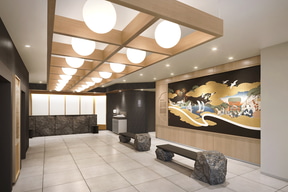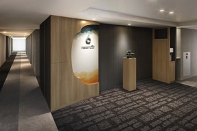 インバウンド需要の回復を背景に、館内全体を刷新した。浅草の歴史や職人文化を現代の感性で再解釈した空間をイメージしているという。1階ロビーには浅草の灯り文化を象徴する提灯格子や、一文字ぼかしを用いたアートワークを配置。素材には浅草寺にも使われている小松石や黒皮風仕上げを採用する。