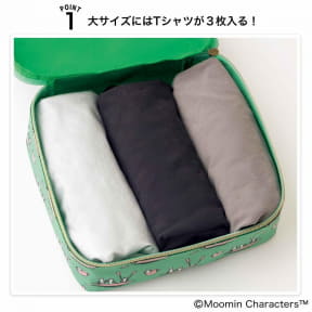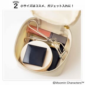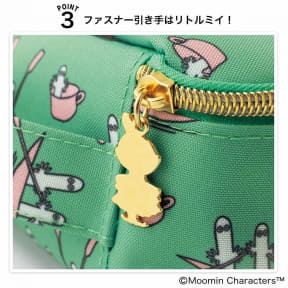 大ポーチはニョロニョロの総柄デザイン。Tシャツが3枚入る大きさで、着替えや下着入れに○。一方、小ポーチはリトルミイを主役にデザイン。コスメやガジェット入れに使えるサイズ感。どちらもファスナーの引き手が“リトルミイ”になっているのもポイントという。
