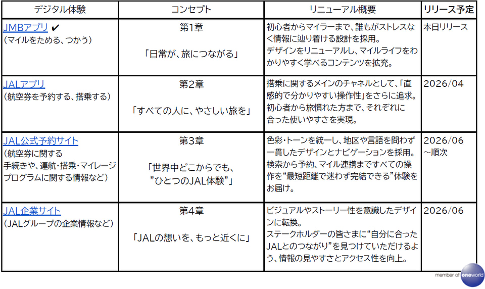第一章として「JALマイレージバンクアプリ(JMBアプリ)」を皮切りに、2026年4月以降は、「JALアプリ」「JAL公式予約サイト」「JAL企業サイト」のリニューアルを順次予定している。