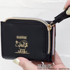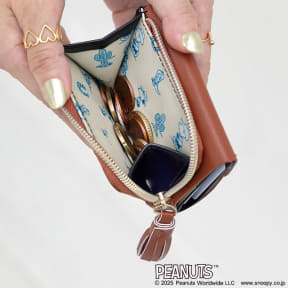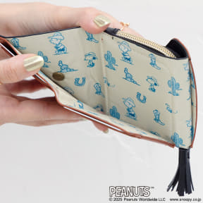 手のひらにおさまるサイズながら、L字に大きく開くお札入れが備わり、コインケースはパカッと開いて中身が見やすい造り。内側の生地は、ウエスタンスタイルに身を包んだスヌーピーとチャーリー・ブラウンの総柄となっている。