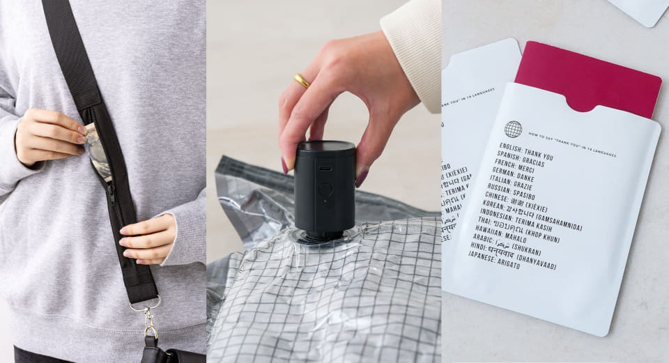 3COINS、新作トラベルグッズ。衣類収納がラクになる自動圧縮機やスキミング防止ケースほか