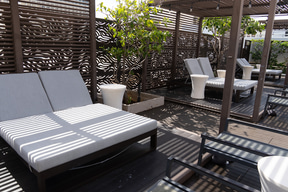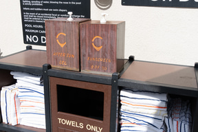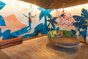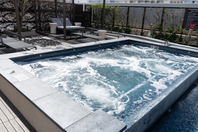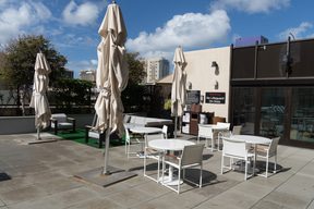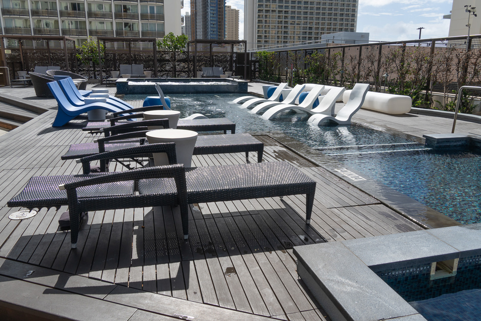 ロビー階でもう一つ目を引くのが、屋外の「スプラッシュラウンジ」だ。施設の都合上、水深のある“プール”は設置できないため、浅めの水遊びエリア(40cm)とホットバス(90cm)を組み合わせた空間になっており、その周囲を取り巻くビーチベッドやカバナも宿泊者なら無料で利用できる。ここも飲食類の持ち込みが許可されているので、ワイキキ滞在中、ビーチまで行く気分じゃない日はここでのんびり過ごすのもよさそうだ。