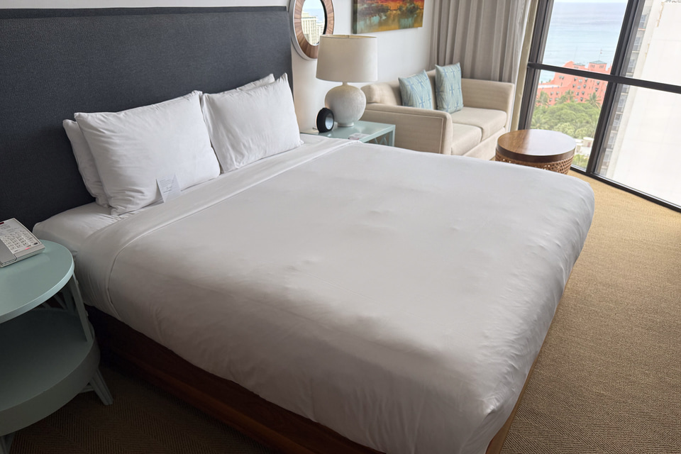 今回滞在した「オーシャンビュー デラックス1キング」に限らず、客室面積は平均40m2を確保している。ワイキキのホテルとしてはかなり広めで、さらに天井が高いこともあって開放感が高い。スペースにゆとりがあるので、スーツケースを開きっぱなしにしても何ら不便ないというのは、特に滞在初日や最終日の荷解き・パッキングの際にうれしいポイントだ。