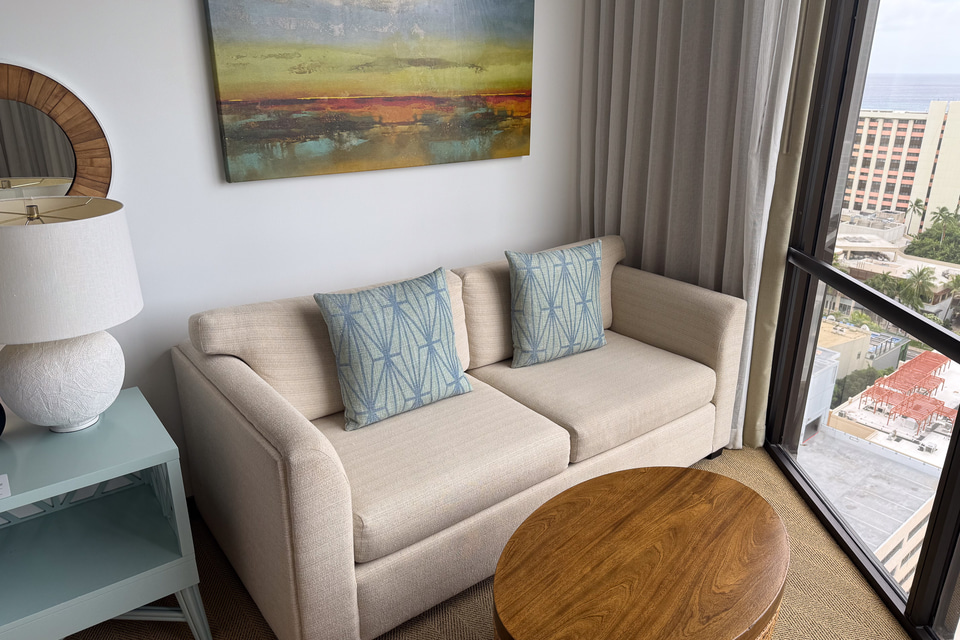 白基調の色使いや細部の装飾、照明などデザイン面は基本的に共通の要素が多いが、例えば「オーシャンビュー スイート 1キング」は前述した“建物の角を活かした”大きな開口部を設けた特別な作り。構造上の制約でラナイ(ベランダ)こそないが、広い採光で客室内は明るく、ワイキキビーチを臨むリビングルームは高い天井と大きな窓に背の低いソファの組み合わせで、視線が奥まで通る。