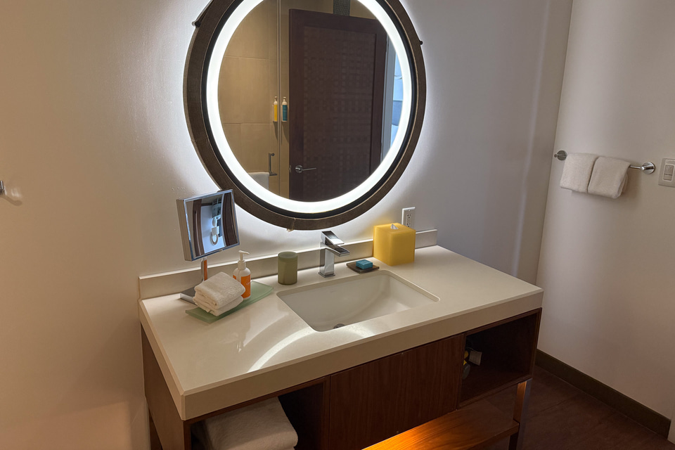 お風呂はガラス張りのシャワーブースで、この客室には独立した浴槽も付いていた。そして、なにがうれしいって温水洗浄便座付きのトイレの存在だ。ハイアット セントリック ワイキキ ビーチではTOTOのウォシュレットを導入していて、もちろんおなじみの使い勝手。これだけで海外旅行の水まわりのストレスが8~9割はなくなる。