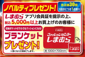 期間中は、しまむらアプリ会員証を提示のうえ、税込5000円以上購入した人に、ノベルティの「オリジナルブランケット」を先着プレゼント。さらに、12月3日~25日はクリスマス無料ラッピングサービスも実施する(サイズはS・M・Lを用意)。