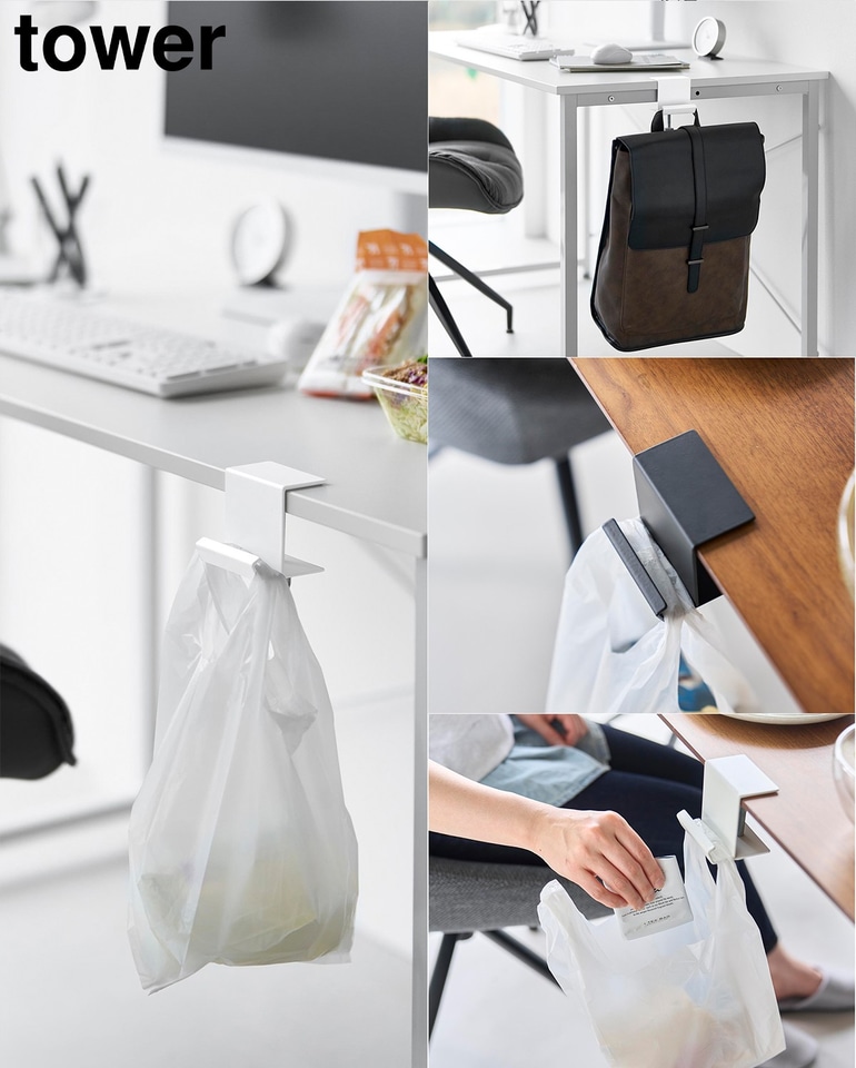 テーブルなどに穴をあけることなく設置できるクランプ式のレジ袋ハンガー。ちょっとしたゴミ袋として使えば、卓上は常に清潔に。リュックやカバンを掛けるバッグハンガーとしても利用できる。カラー展開はホワイトとブラックの2種で、価格は1485円。