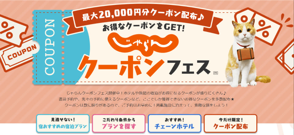 じゃらん、最大2万円引き「クーポンフェス」12月18日まで。ホテル・温泉宿をお得に予約
