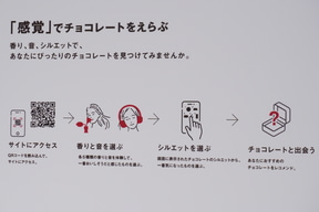 来場者は店頭のQRコードをスマホで読み取り、表示される質問に答えると、50種類のなかから自分にぴったりなチョコレートを1つ提案してもらえる。質問は「香り」「音」「シルエット」の3つで、香り・音は展示されている5種類を実際に試して選択する仕組みとなっている。