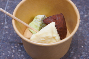 体験後にはイベント限定の未発売チョコレートの試食も楽しめる。提供されるのは、しみこみチョコのキウイとパイナップル、カカオトリュフ クランベリーの3種類。