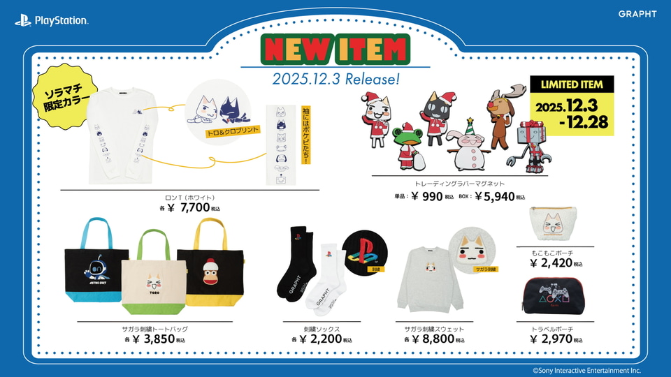 ラインアップは以下のとおり。GRAPHTのECサイトのほか、2026年3月10日まで営業する「PlayStation Official Licensed POP UP STORE by GRAPHT in 東京ソラマチ」(東京都墨田区押上1-1-2 東京ソラマチ3階タワーヤード 5番地 ワゴンショップ)でも取り扱う。