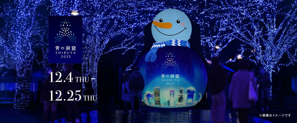 渋谷公園通りから代々木公園ケヤキ並木にかけて、約900mが青の光で染る冬の風物詩。設置電球数は全94本、約50万球におよぶ。2025年のテーマは、光り輝く巨大な雪だるまが登場する「青の洞窟 THE SNOWMAN」。昨年好評だった巨大バルーンを、今年は雪だるまの姿へと進化させ、より親しみやすく温かな世界観を演出するという。