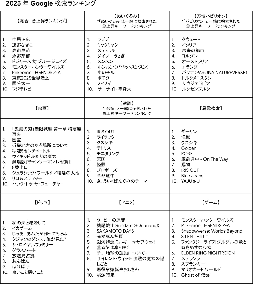 Googleは12月4日、2025年Google検索ランキングを発表した。1月1日~11月20日の期間、昨年と比較して急上昇したキーワードを集計したもの。
