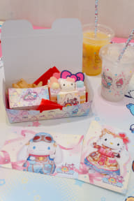 フードコートで提供する限定メニューには「35thアニバーサリーケーキ」(1500円、ノベルティのオリジナルポストカード付き)が登場。キティちゃんのマシュマロやリボンの飾りをトッピングしたかわいらしいデコレーションが特徴で、土台は甘酸っぱいいちごソースを挟んだふんわりショートケーキになっている。セットでポテトやドリンクを付けるのもオススメだ。