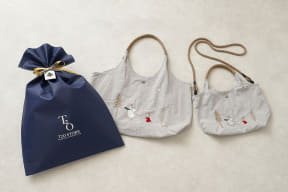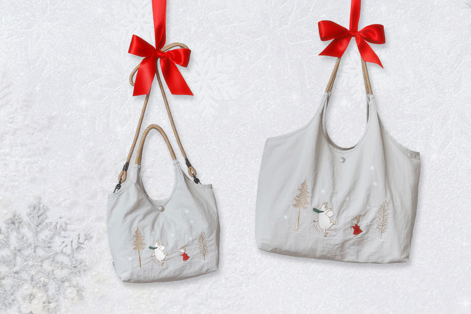 ムーミンとリトルミイが雪のなかで楽しそうに過ごす、冬のワンシーンをリッチな刺繍で描いたデザインが特徴。生地は軽撥水加工のナイロン素材なのでレジャーや雨の日にも使いやすい。どちらも軽量ながら、内側にはファスナー付きポケットを備え、ニョロニョロが刻印されたボタンや、ロープ風にした持ち手の設計にもこだわる。