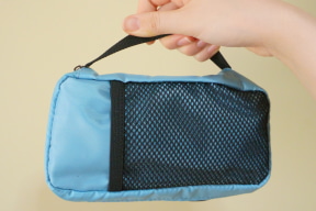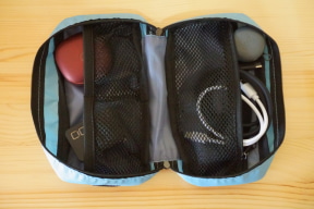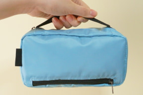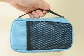 ハンドル付きで、充電ケーブルやモバイルバッテリー、ワイヤレスイヤフォンといった小物を持ち運ぶのに便利だが、個人的には自宅での貴重品入れやデスクに常備したいアメニティグッズ用のポーチとして使うほうがよさそう。